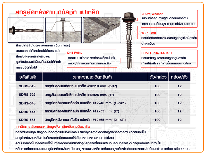 ใช้สำหรับยึดผนัง หลังคาเมทัลชีท สังกะสี เข้ากับโครงเหล็ก